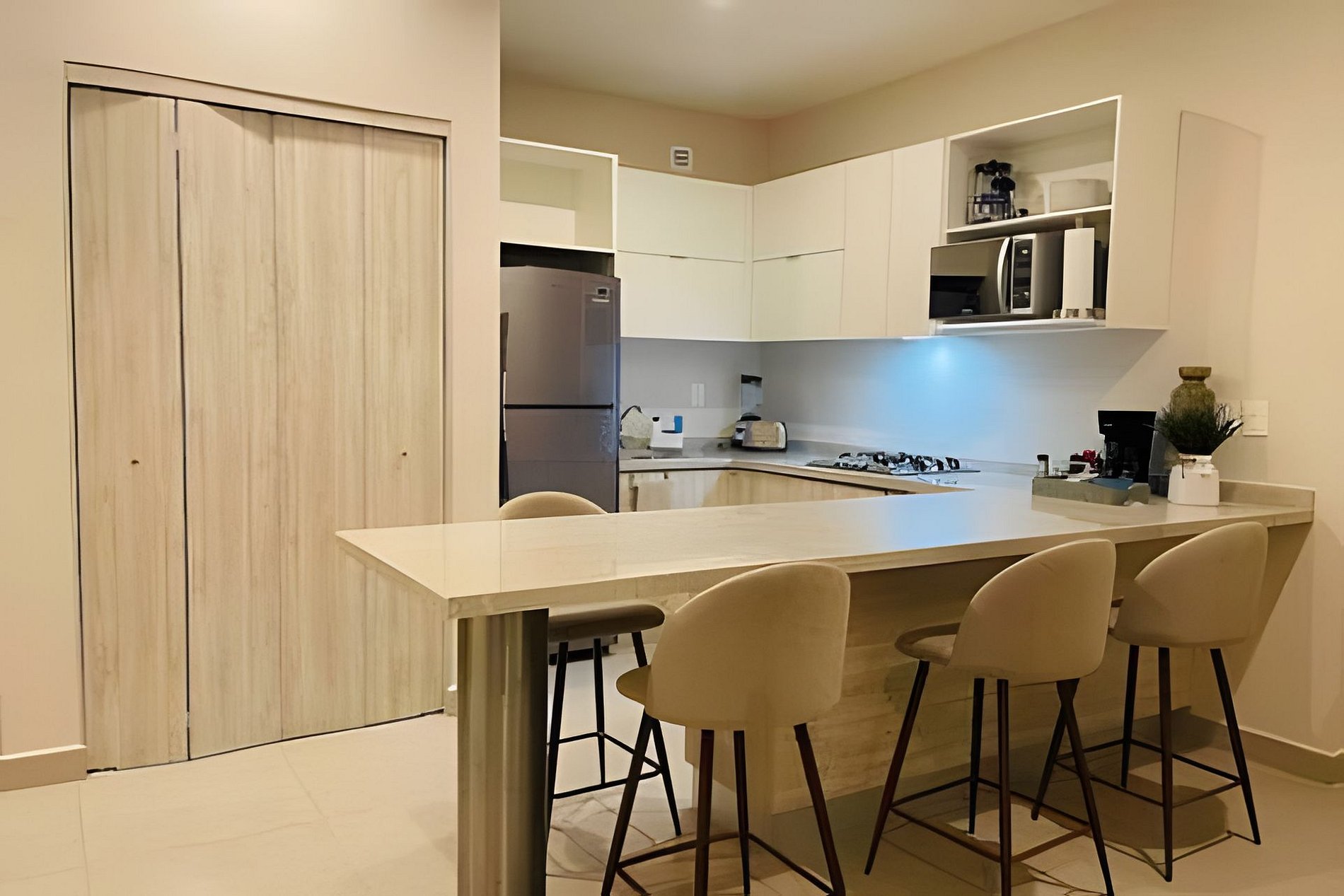 Bienvenidos a nuestro lujoso apartamento nuevo, ubicado a solo unos pasos de la famosa Arena Monterrey. Esta elegante y moderna unidad tiene capacidad para 6 personas, con una cama queen, 2 camas individuales y un comodo sofá cama, lo que lo hace perfecto para familias o grupos de amigos. Disfrute de la comodidad del aire acondicionado y de las mejores amenidades, que incluyen una cocina totalmente equipada, Wi-Fi gratuito y un área de barbacoa.